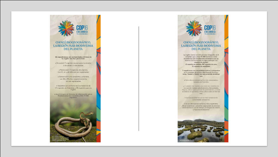 1. Vestir a las poblaciones con mensajes alusivos al papel de la gente en el conocimiento, conservación, uso sostenible y recuperación de la biodiversidad. Instalamos 10 referencias de pendones de 2.5 metros de alto por 1.0 metros de ancho en lugares visibles de Quibdó, Buenaventura, Guapi, Tumaco, Pereira, Apartadó y Montería, los cuales estarán visibles hasta que termine la COP16.
