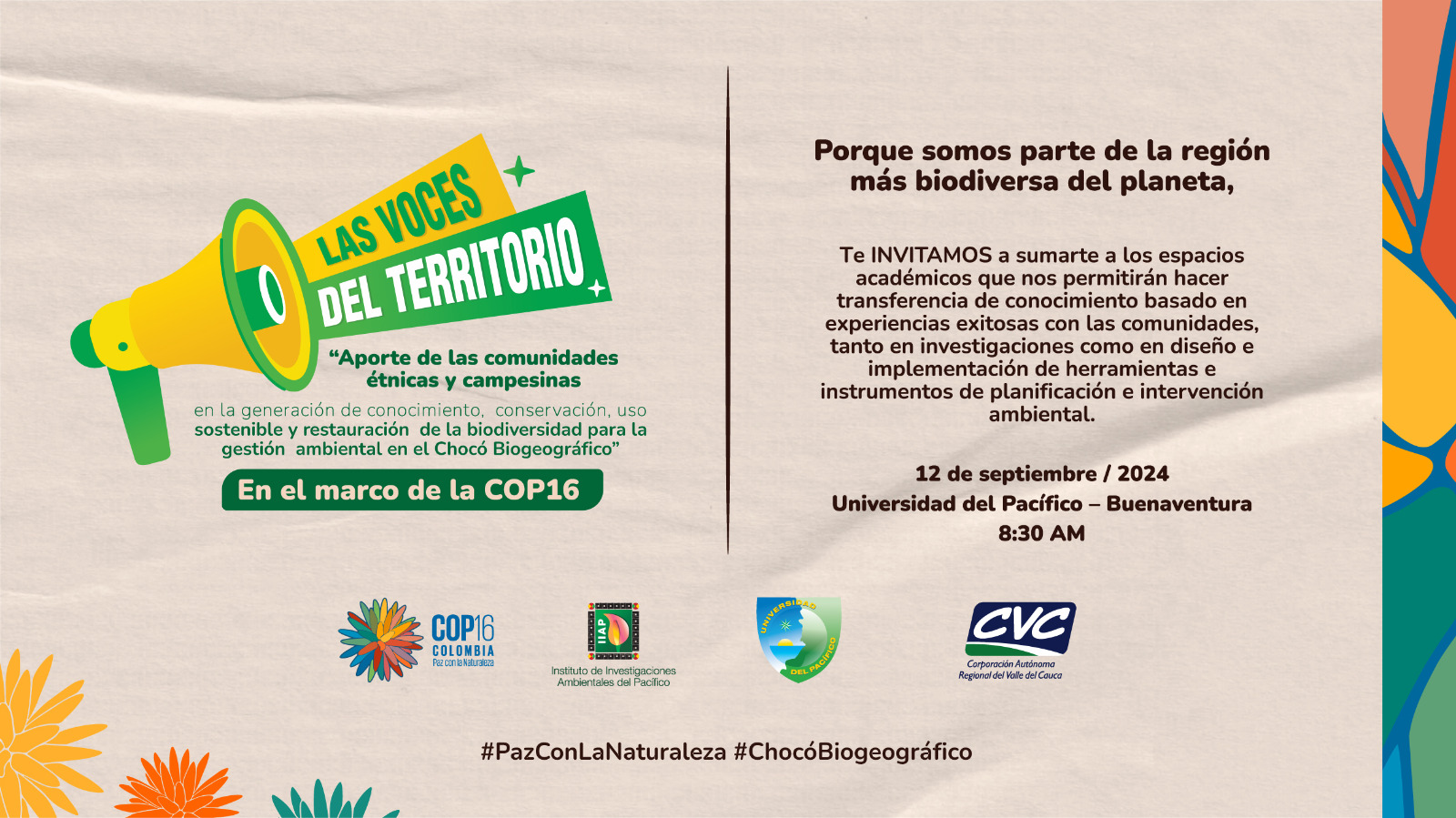 Entre el 10 y 13 de septiembre se realizarán estas jornadas que convoca a un público diverso de aproximadamente 100 personas. Durante la actividad se desarrollarán presentaciones magistrales y paneles sobre la COP16, contexto del Chocó Biogeográfico, generación de información y conocimiento, conservación, uso sostenible y recuperación de la biodiversidad regional. Las fechas y lugares de cada una de ellas son las siguientes: