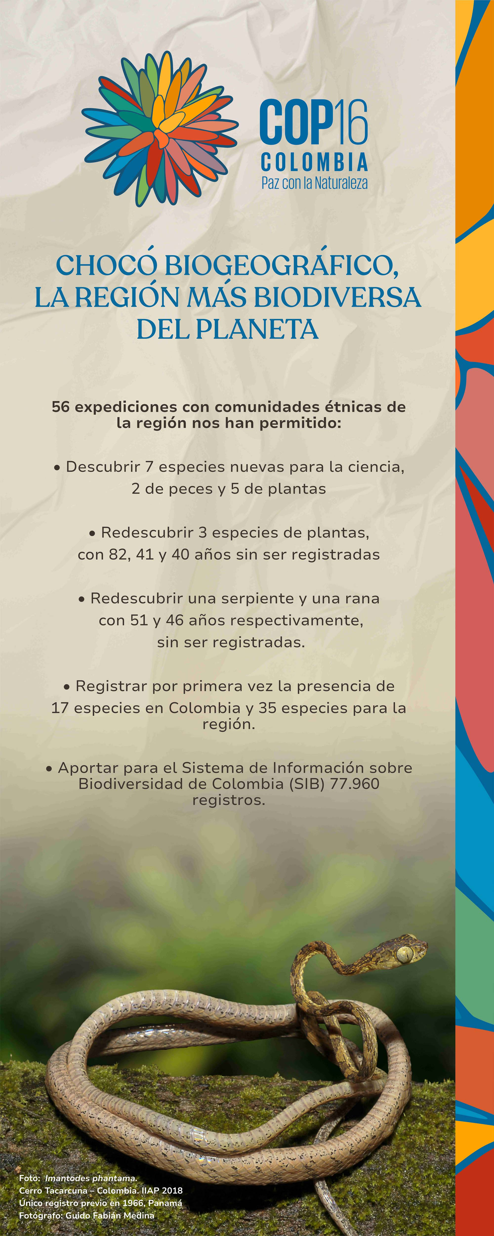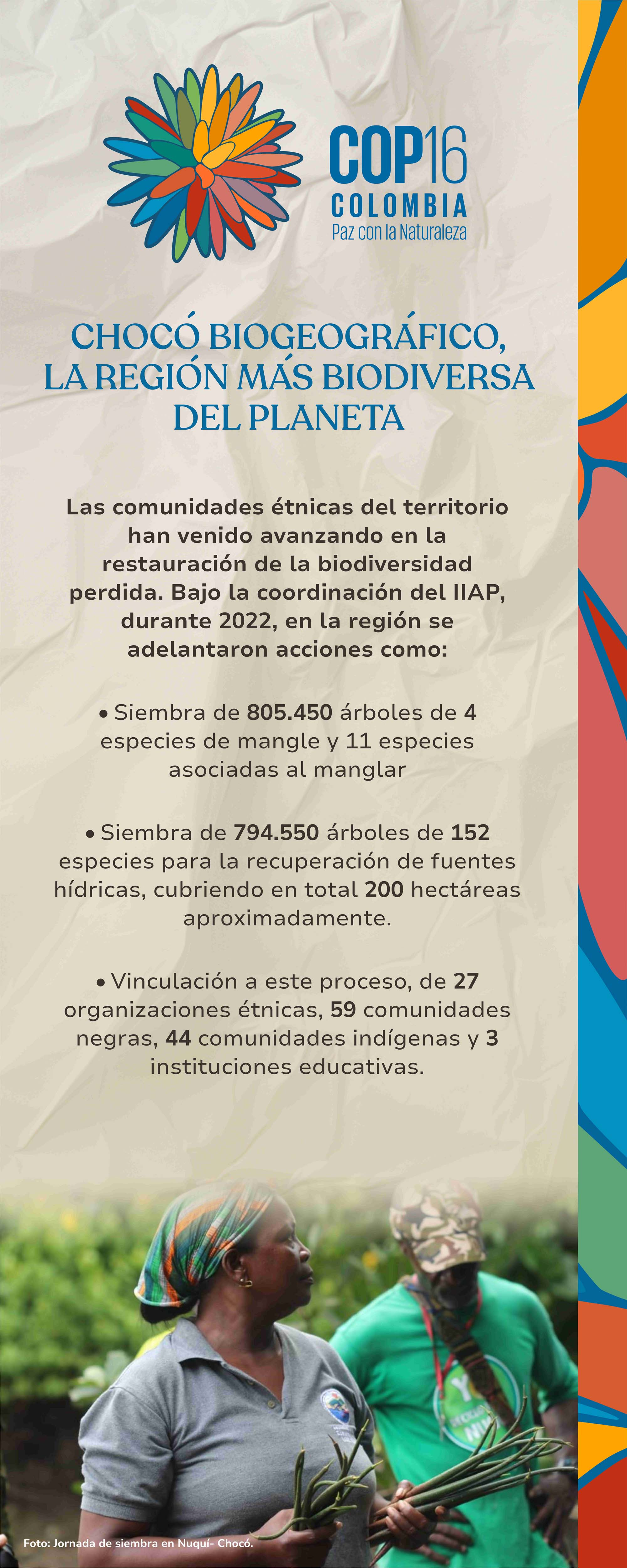Fueron más de 8 meses implementando, a través de las estrategias pre COP, un trabajo de empoderamiento y reconocimiento de la COP16 de la cual mucho se escuchaba pero pocos lograban dimensionar su importancia y el papel que podríamos jugar en ella. Como IIAP visitamos 10 ciudades de nuestra área de influencia, destacando fortalezas en materia de biodiversidad y con ello dejando claro la apuesta como región del Chocó Biogeográfico (ChB), la cual no fue otra que: “Hacer un reconocimiento y visibilizar el aporte de las comunidades asentadas en territorio, al tema de conservación de la Biodiversidad, la cual han soportado sobre sus hombros pese a las condiciones de pobreza en que se vive”